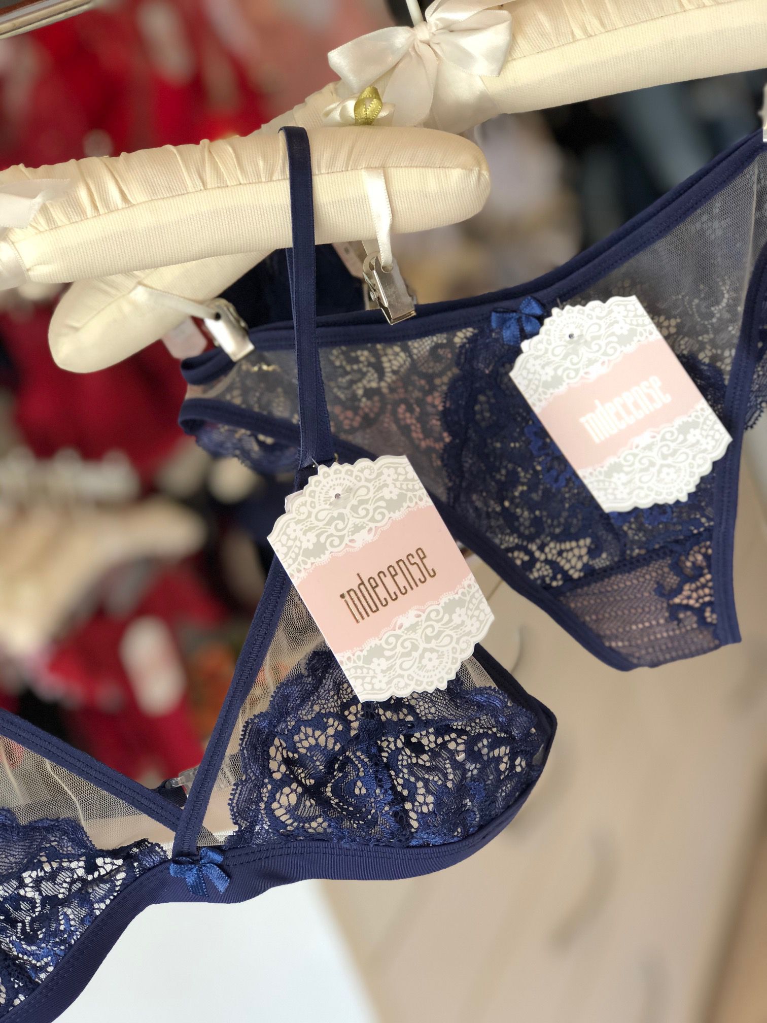 Conjunto de sutiã renda com detalhes em tule, sem regulagem nas costas.
